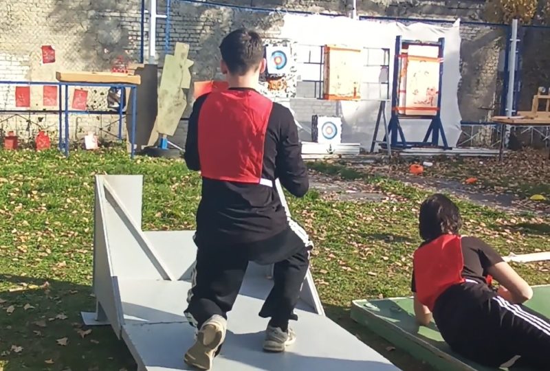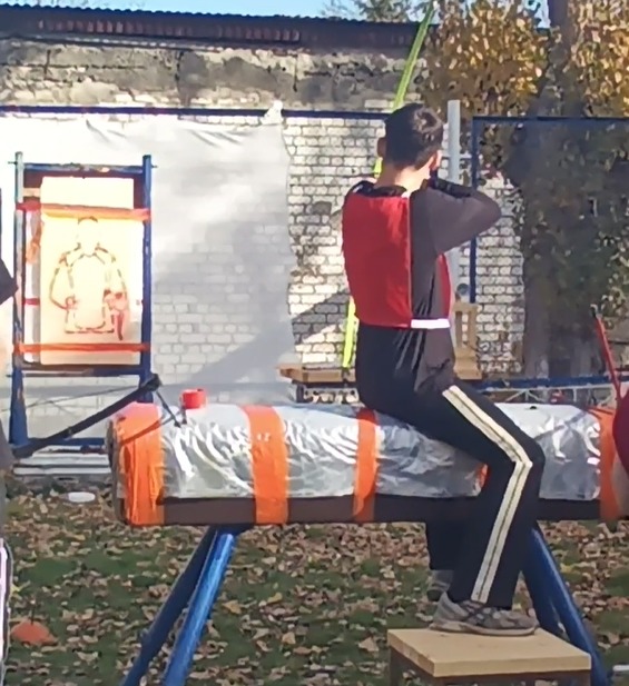 Стрельба ведется из традиционного лука, на выполнение условий выдается три стрелы. Следующий этап – это стрельба из пневматического ПМ по падающим мишеням, количество мишеней – три, количество выстрелов — пять. При непоражении штрафной круг.