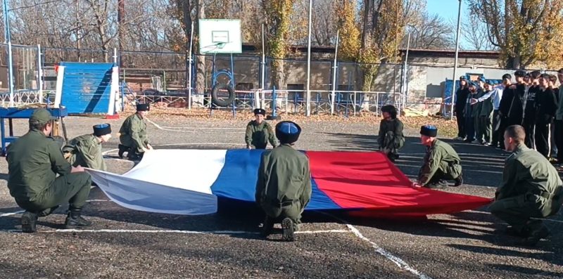 Четыре казака пронесли Российский триколор перед строем, и прикрепили его к тросу.