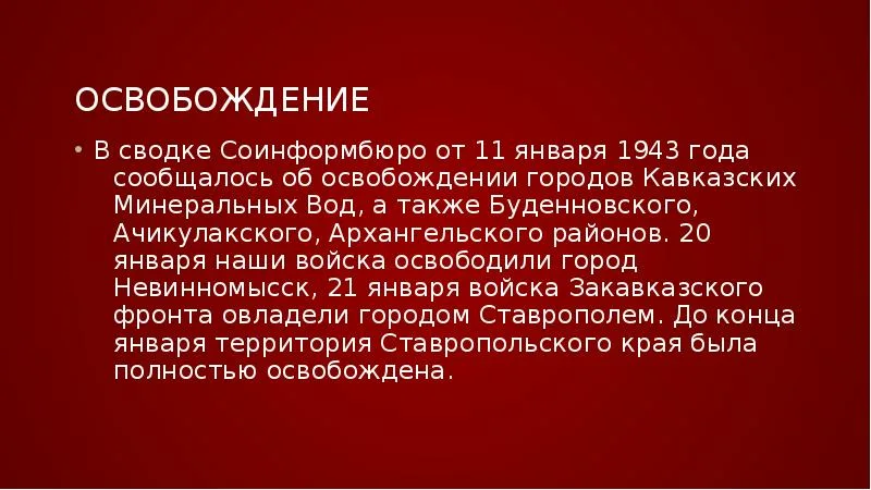 11 января 1943 года группа войск Закавказского фронта освободила Кавказские Минеральные Воды и большую часть КБР от немецко-фашистских захватчиков. Ровно 83 года назад, солдаты и офицеры войсковых частей 9 Армии самоотверженно уничтожали противника в районе Минеральных Вод, танкисты из 2 танковой бригады зачищали хутор Садовый, село Левокумка, артиллеристы 863 истребительно-противотанкового артиллерийского полка вместе с пехотинцами 131 стрелковой бригады выбивали противника из городских кварталов и гнали в сторону Побегайловки. Одновременно красноармейцы вошли в Минеральные Воды, где отбили у врага железнодорожную станцию и атаковали немецкие эшелоны, тем самым не позволив врагу сбежать по ж/д. Особенно отличился в боях танковый батальон под командованием капитана Петрова, а также 52-я танковая бригада.