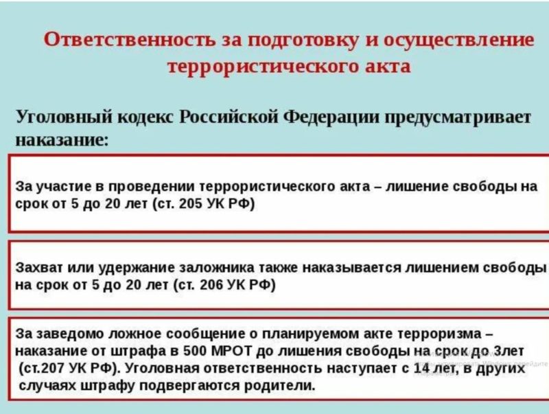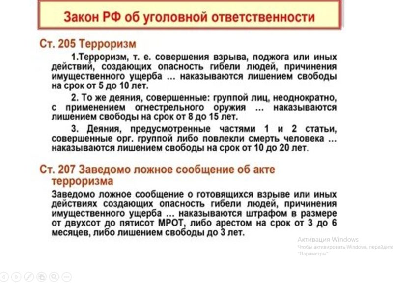 Студенты ознакомились со статьёй 207 Уголовного Кодекса РФ, где приведено наказание за заведомо ложное сообщение об акте терроризма, статьей 205 УК РФ «Совершение террористического акта».